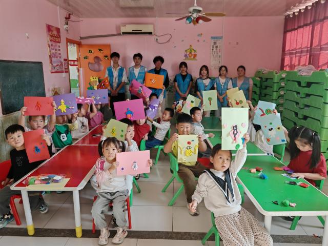 活动伊始,志愿者通过播放经典动画《小兵张嘎》,以生动直观的画面将少年英雄的勇敢与担当呈现在小朋友们面前,小朋友们认真观看,稚嫩的脸庞上满是专注,眼中充满了对少年英雄的崇敬与向往。随后,志愿者以“你心目中的英雄”为主题开启互动分享,鼓励小朋友们讲述自己了解的红色故事,小朋友们踊跃举手发言,一个个故事接连涌现,现场氛围严肃而热烈。接着,在志愿者帮助下,小朋友们利用彩纸、画笔和黏土进行手工创作,用一幅幅精美的作品表达了对英雄的敬意。活动最后,全体小朋友在志愿者的带领下高举自己的作品,齐声喊出“传承英雄志,勇担时代责”的口号,稚嫩的童声汇聚成温暖而坚定的力量。
