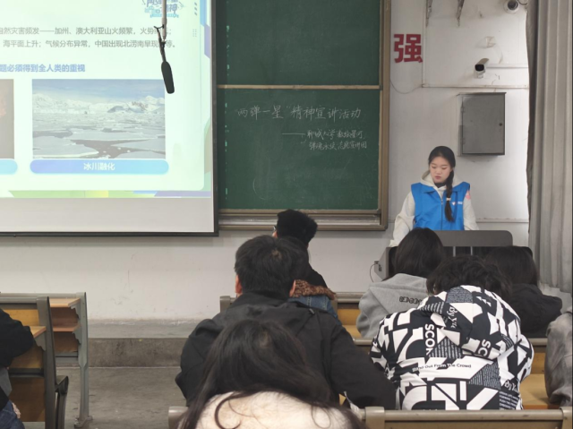 为普及碳达峰、碳中和相关知识,增强学生绿色环保意识,10月26日,聊城大学“数绘星河,弹魂永续”志愿宣讲团联合美术与设计学院于7号教学楼201教室开展“‘核’力碳达峰,助力碳中和”暨“两弹一星”精神宣讲活动,美术与设计学院2025级部分学生参与。