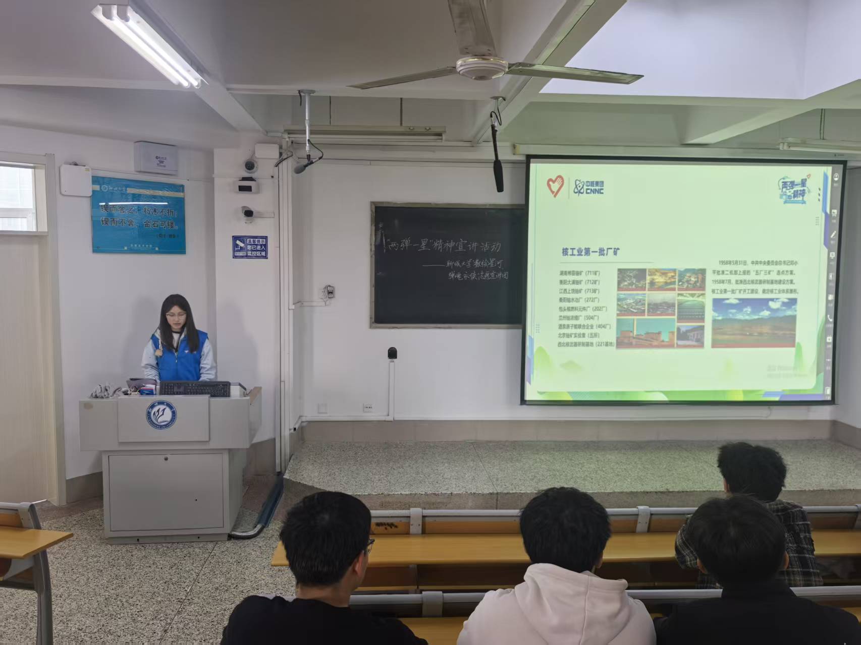 本次宣讲围绕党领导下的中国核工业发展历程、“两弹一星”精神的形成与传承以及新时代核工业的使命与前景三部分展开。宣讲伊始,志愿者向同学们生动讲述了中国核工业从1955年创建至今70年的发展历程。从毛泽东“开始要钻原子能这样的历史新时期”的重要指示,到邓小平“如果六十年代以来中国没有原子弹、氢弹,就没有现在这样的国际地位”的精辟论述,志愿者用一个个鲜活的事例,再现了那段波澜壮阔的历史。随后,志愿者阐释了“两弹一星”精神的深刻内涵,通过讲述钱学森、邓稼先、王淦昌等科学家的感人事迹,展现了他们“热爱祖国、自力更生、大力协同”的伟大精神。同时,志愿者还介绍了“四个一切”的核工业精神和“强核报国、创新奉献”的新时代核工业精神,让他们对核工业精神谱系有了更全面的认识。最后,志愿者通过展示“华龙一号”全球首堆商运、聚变能源研究等最新成就,描绘了新时代核工业发展的美好前景。