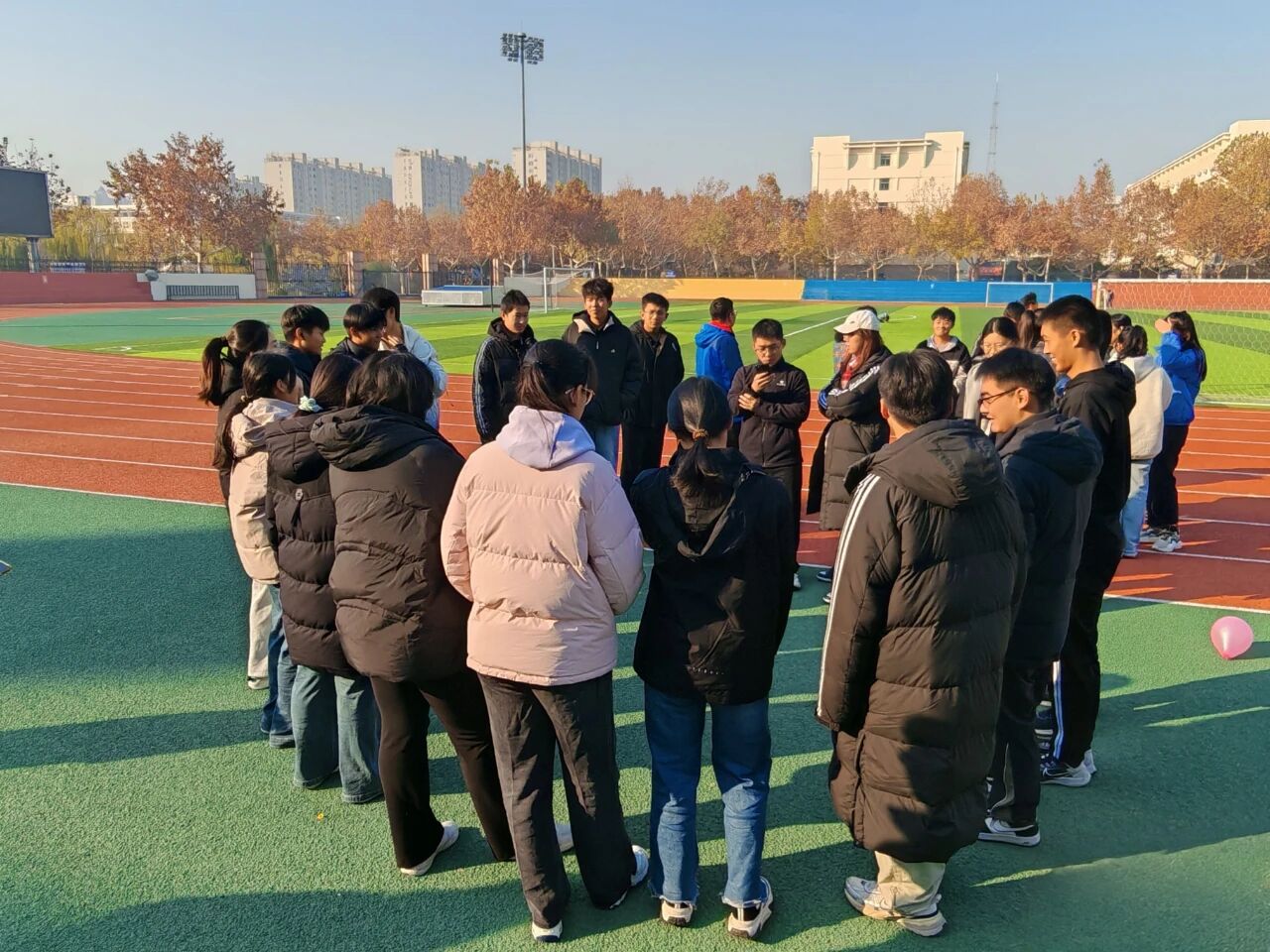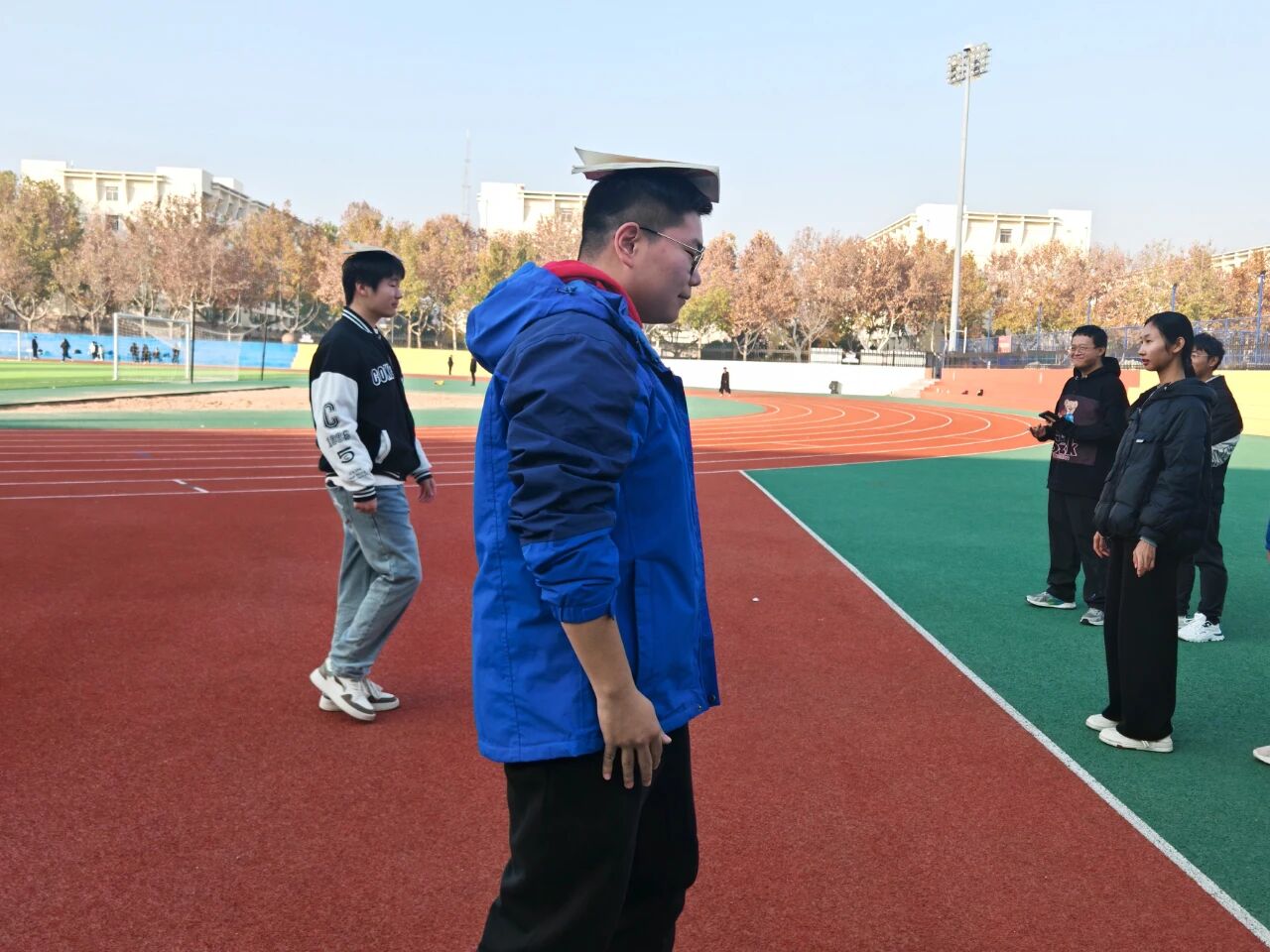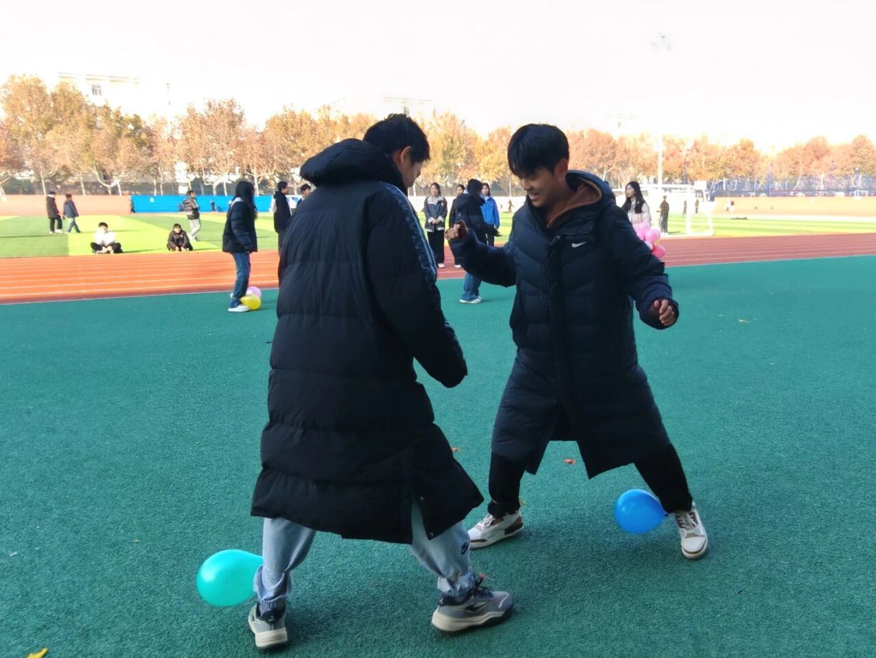 在分配队伍、集体热身后,趣味运动会正式开始。本次活动以“筑牢安全防线,共创文明公寓”为主题,共设置六个兼具趣味性、竞技性、协作性的团体比赛项目。“稳书护安,消防接力”,队员头顶书本,小心翼翼地保持平衡,接力到达终点;“双背传球,消防竞速”,参赛人员两两合作,背对背夹住气球,保持高度的默契和配合;“气球攻防,安全对决”,他们在保护自己气球的同时,设法踩破对方的气球,比拼速度和反应力。