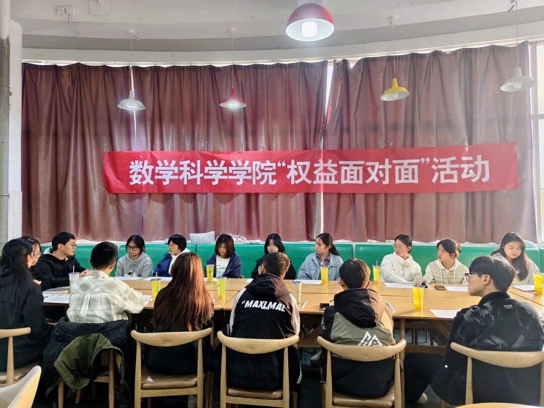 为进一步了解学生诉求,加强学生与学院的沟通交流,10月23日,数学科学学院于湖苑餐厅举办“权益面对面”活动,本次活动由权益服务部主要负责人王雪主持,辅导员张琦、牛玉帅,权益服务部负责人刘馨悦、周瑞琪以及2024级、2025级各班生活委员参加。