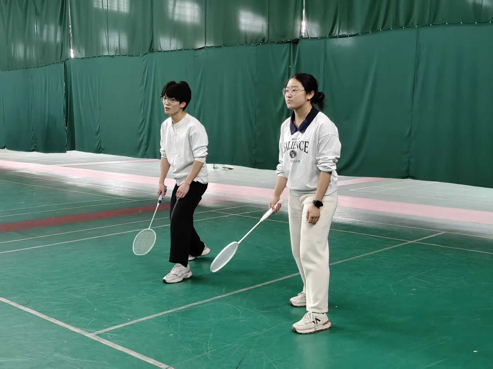 羽毛球赛场上,单打选手们个个精神饱满、步履敏捷,凭借娴熟的技巧展开多轮激烈角逐。每一次精准凌厉的发球,都划出完美弧线;每一次强劲有力的跳起扣杀,都引得全场惊呼;每一次灵巧轻放的网前吊球,又尽显智慧与细腻。在双打配合中,选手们发球落点精准利落,配合默契,后攻前封的强势进攻、左右站位的严密防守、专攻中路的巧思战术,将团队协作能力展现的淋漓尽致。