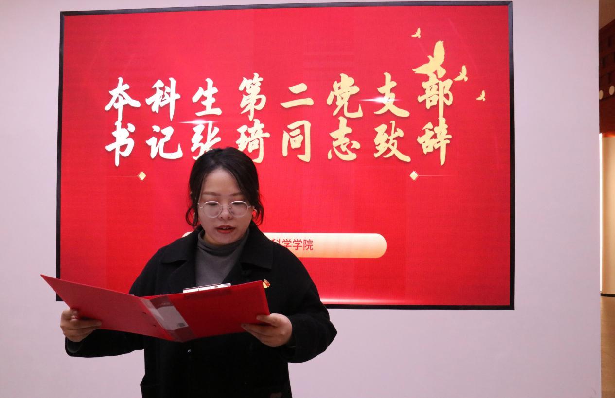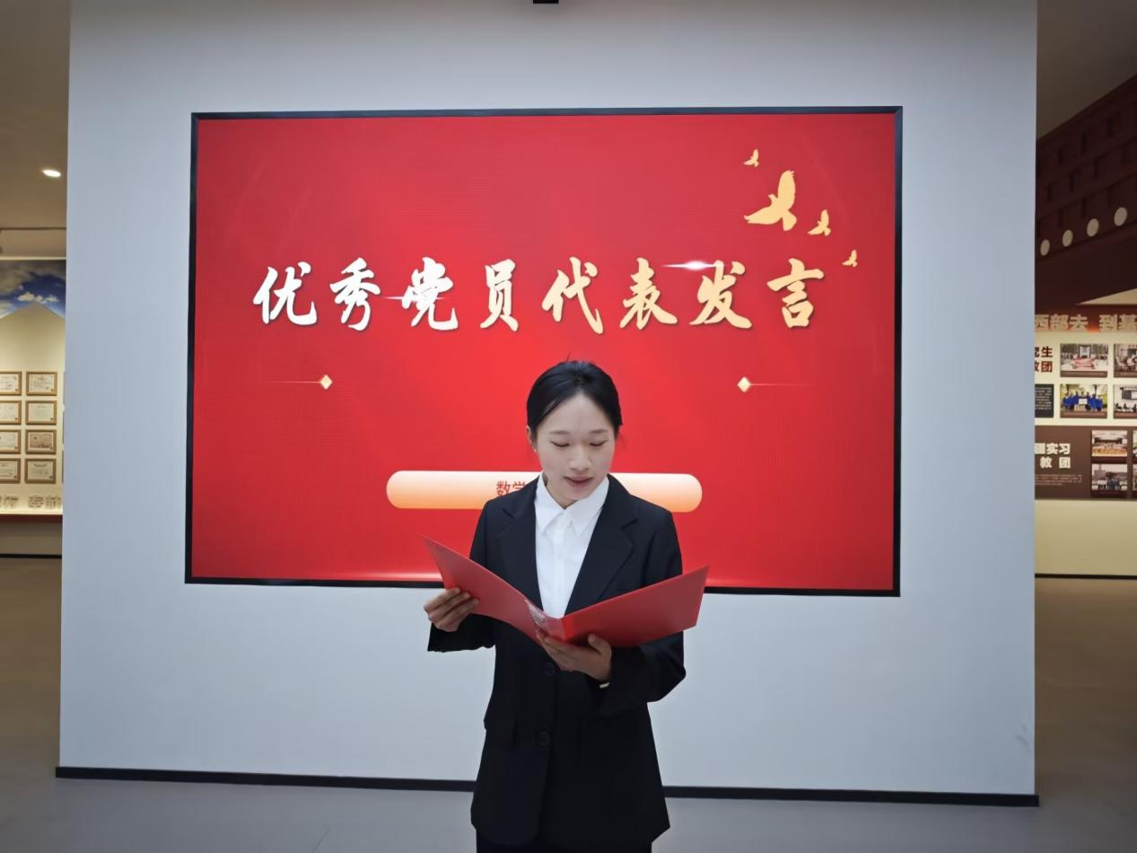 优秀党员代表刘雨欣同志则结合自身成长感悟向新党员发出号召:一是在专业学习中筑牢信仰根基,保持政治上的清醒与坚定;二是在学生工作中践行初心使命,将远大的理想抱负融入脚踏实地的奋斗;三是在日常生活中树立先锋形象,以先锋形象诠释党员的先进性与纯洁性,在青春赛道上以实干姿态勇毅前行。