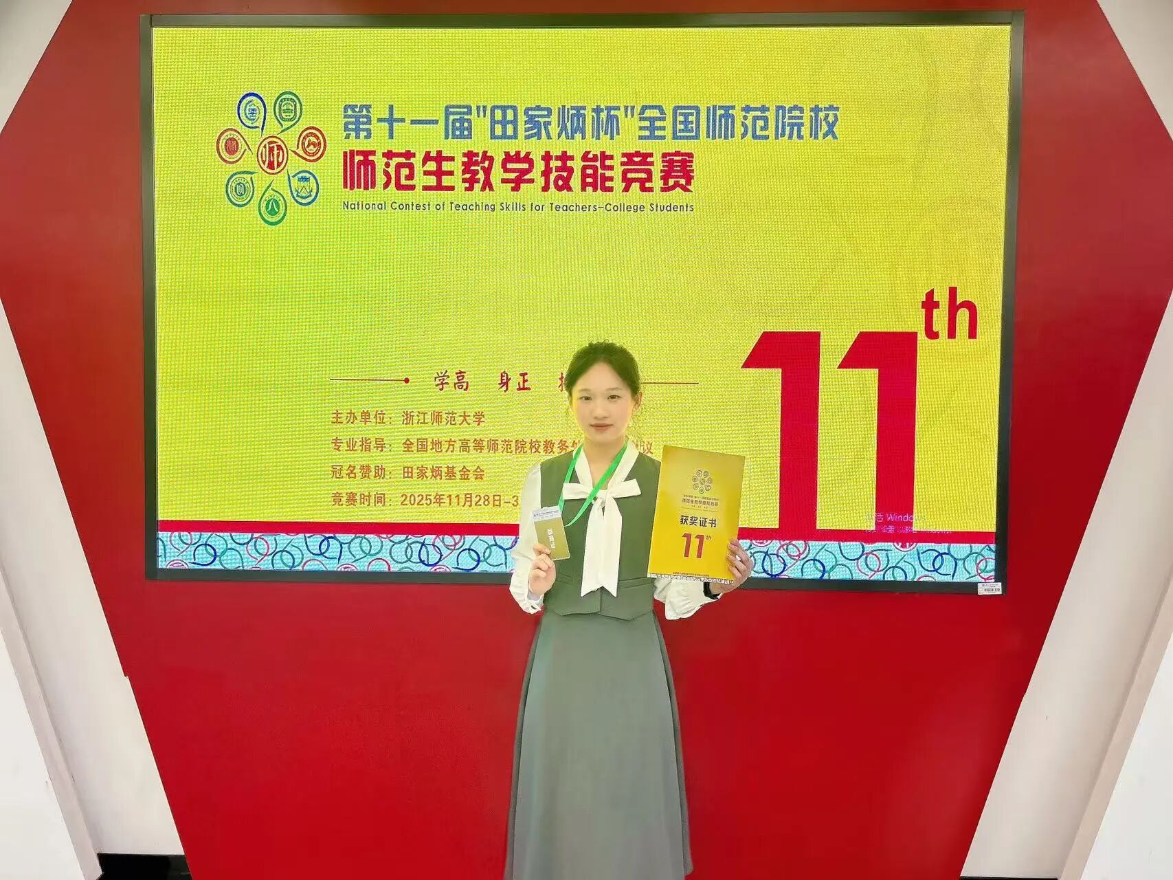11月28日至11月30日,第十一届“田家炳杯”全国师范院校师范生教学技能竞赛决赛在浙江师范大学举行。经过激烈角逐,我院数学与应用数学专业2022级4班刘雨欣表现卓越,荣获数学与应用数学组一等奖。