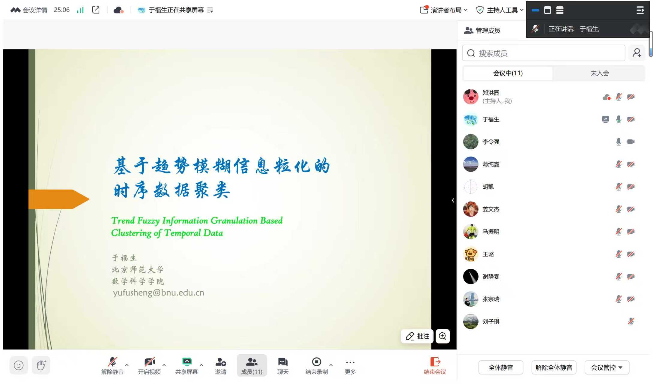 2026年1日18日,受聊城大学数学科学学院和聊城大学学报(自然科学版)的邀请,北京师范大学于福生教授作了题为“基于趋势模糊信息粒化的时序数据聚类”的学术报告。报告由李令强教授主持,不确定性的数学理论与应用团队方向的老师和研究生参加了本次报告会。
