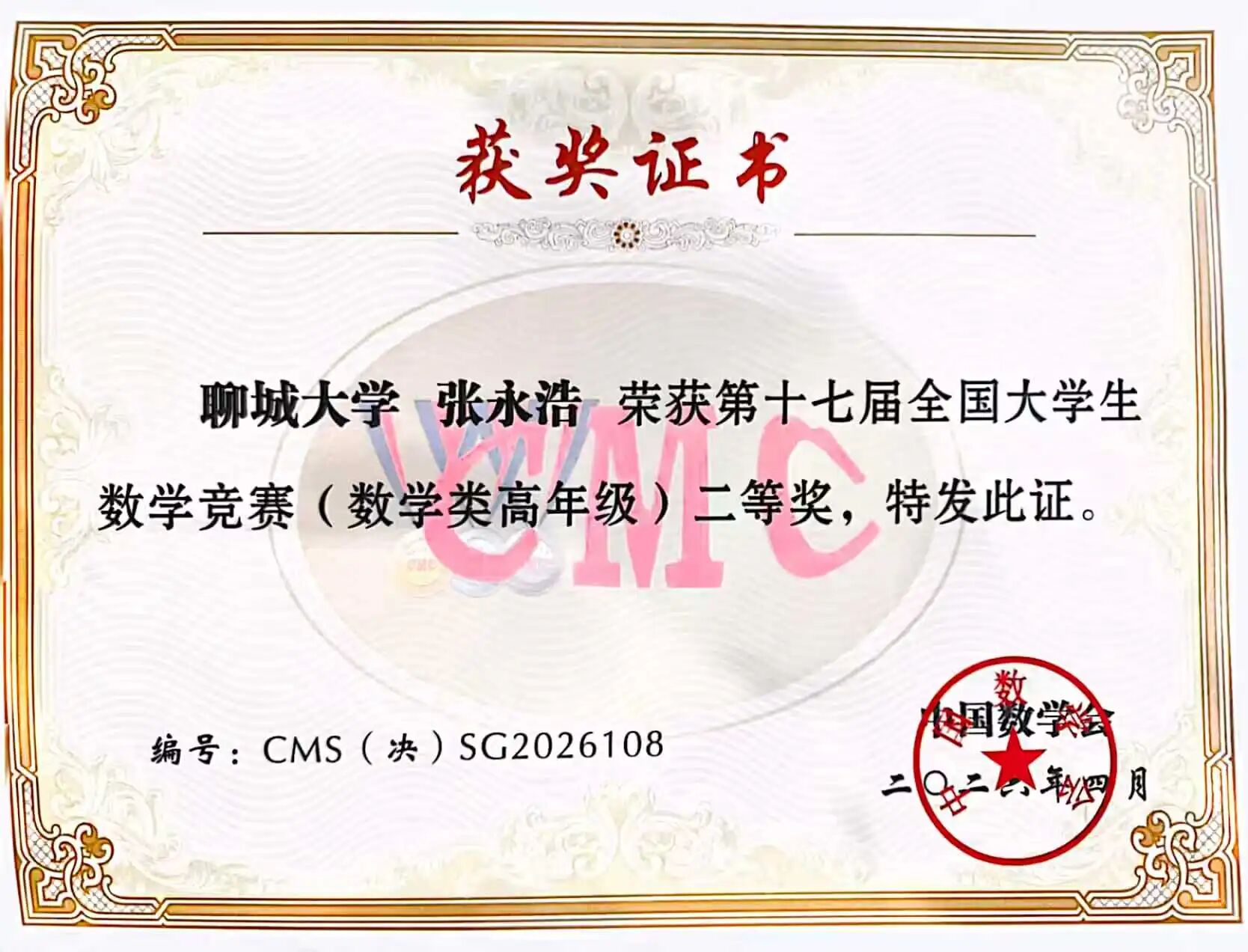 面对本次比赛,张永浩凭借扎实的数学理论功底与严谨的逻辑推理能力,最终斩获国家级二等奖,充分展现了我院学子深厚的专业素养、过硬的学术能力和从容自信的精神风貌。据悉,张永浩同学学业成绩始终名列前茅,此前已顺利通过山东大学数学学院研究生复试,成功被录取为2026级基础数学方向硕士研究生。此次竞赛佳绩,既是他勤学善思、刻苦钻研的丰硕成果,也是他持之以恒、追求卓越的最好见证。